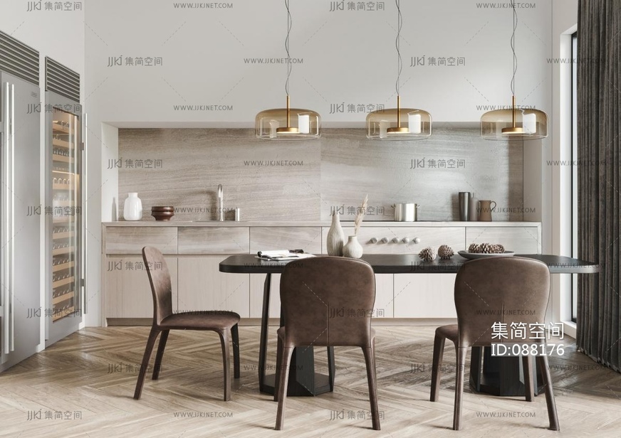 01北欧现代餐厅厨房,餐桌椅橱柜 3d模型下载 [模型ID:88176]