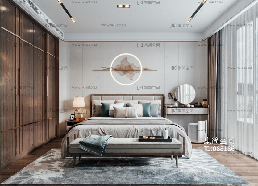 11新中式主卧室,双人床,床尾凳塌床头柜梳妆台,化妆台 3d模型下载 [模型ID:88186]