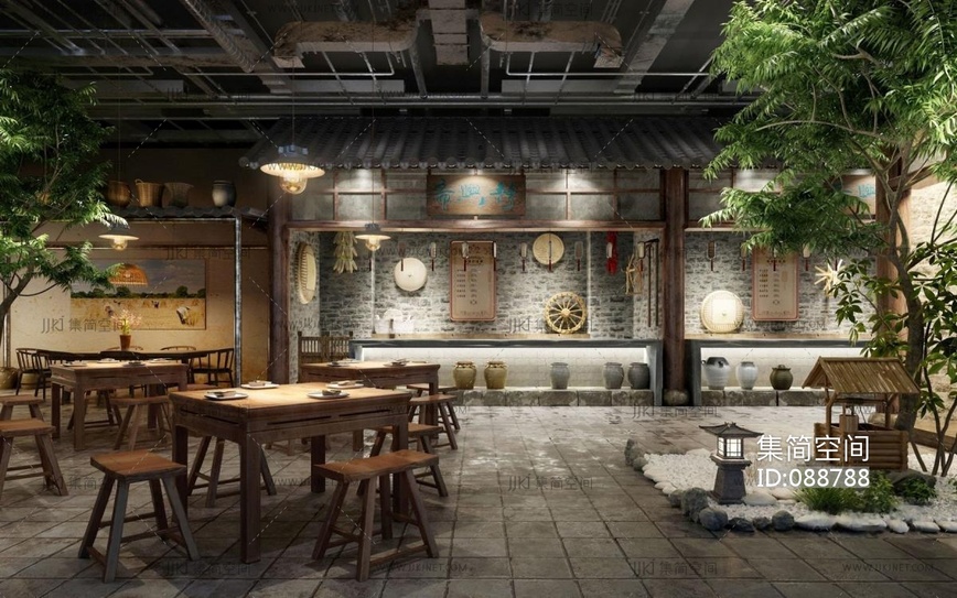 自然风民俗民宿新中式餐厅 3d模型下载 [模型ID:88788]