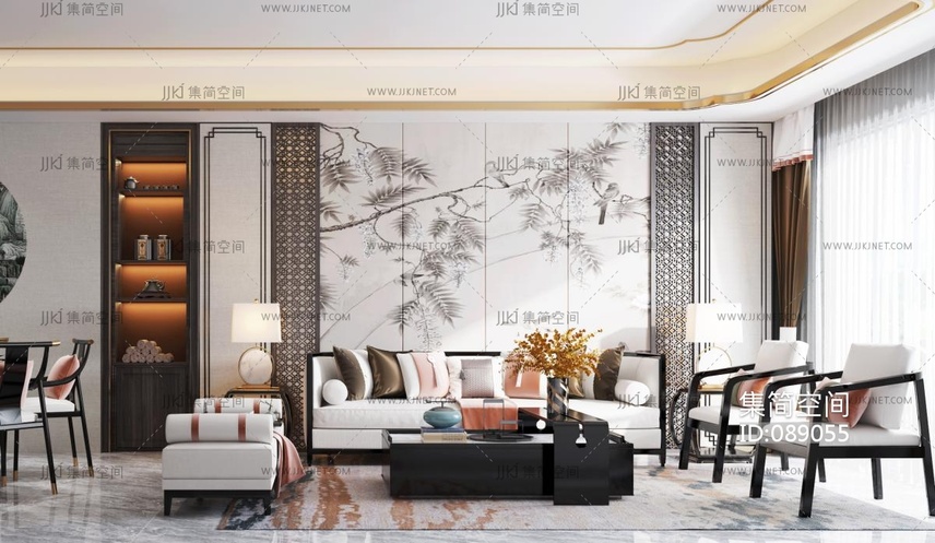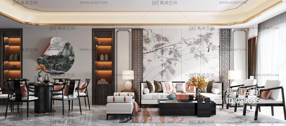新中式客餐厅,沙发,餐桌椅,茶几 3d模型下载 [模型ID:89055]