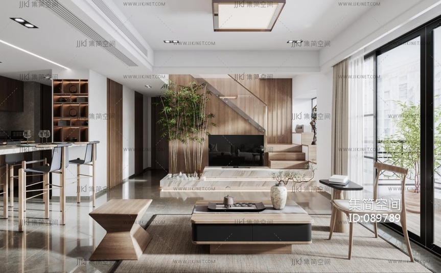 中古风客厅 沙发茶几组合 背景墙3d模型下载