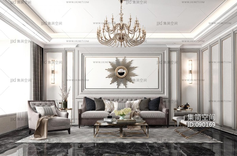 中古风客厅,美式客厅,圆形茶几,装饰画,移动电视,3d模型下载
