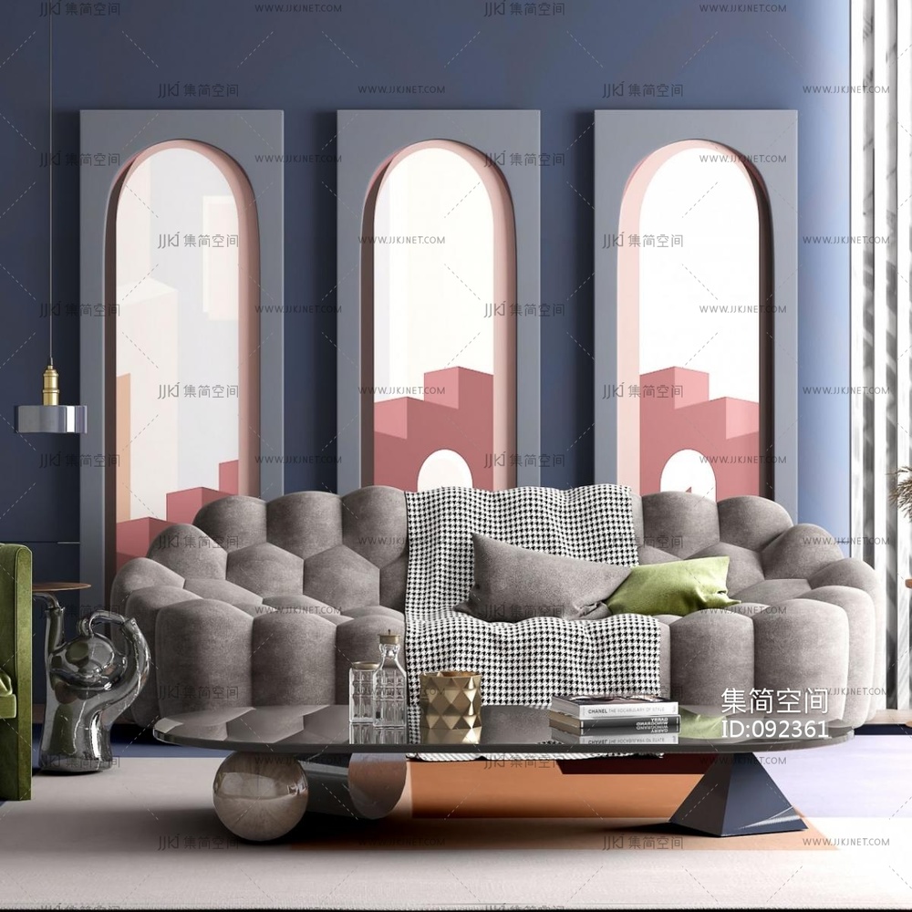 中古风客厅,美式客厅,圆形茶几,装饰画,移动电视,3d模型下载
