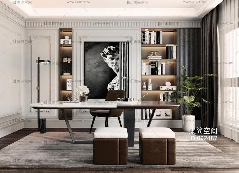 现代书房 书桌椅 壁柜 挂画 吊灯 书 盆栽 摆件3d模型下载