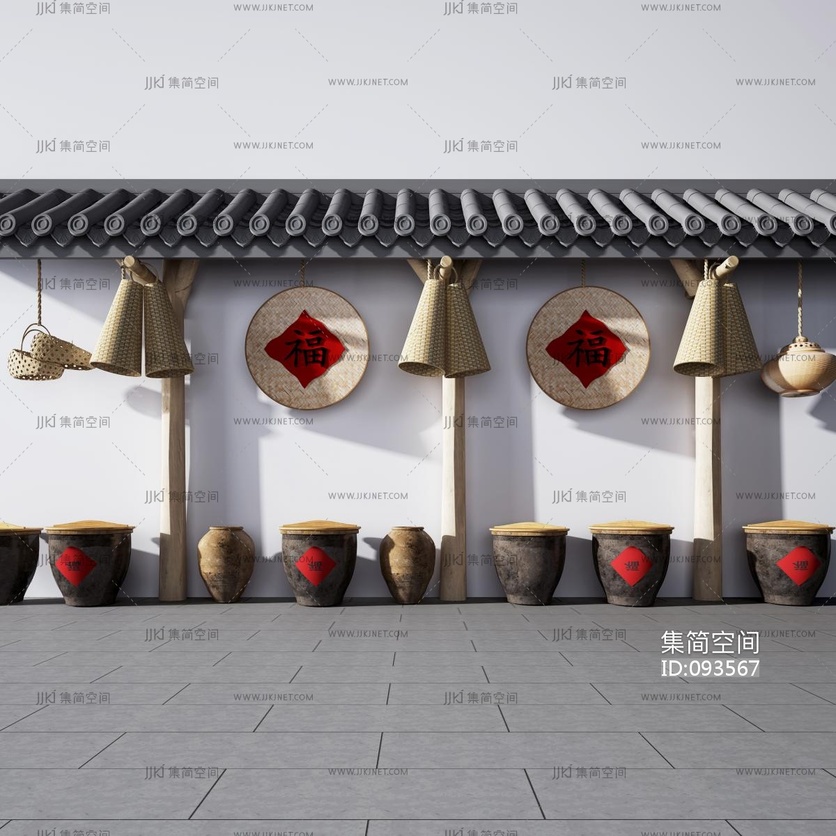 新中式乡村,走廊围墙酒缸农具组合 3d模型下载 [模型ID:93567]