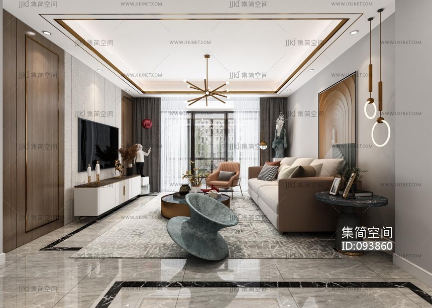 中古风客厅,美式客厅,圆形茶几,装饰画,移动电视,3d模型下载