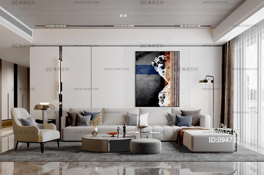 中古风客厅,美式客厅,圆形茶几,装饰画,移动电视,3d模型下载