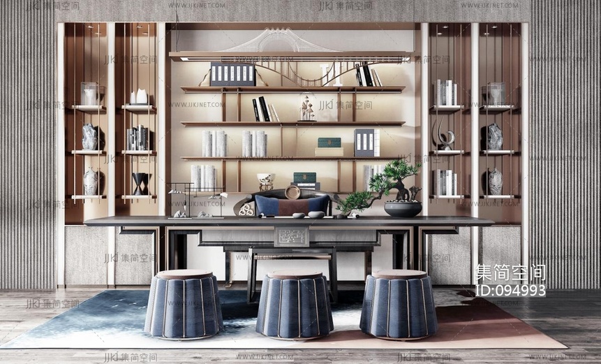 新中式茶桌椅书柜 3d模型下载 [模型ID:94993]