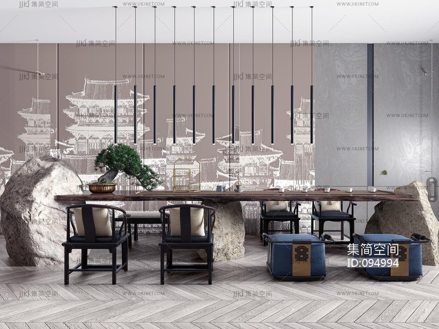 新中式长条形茶桌椅,茶台 3d模型下载 [模型ID:94994]