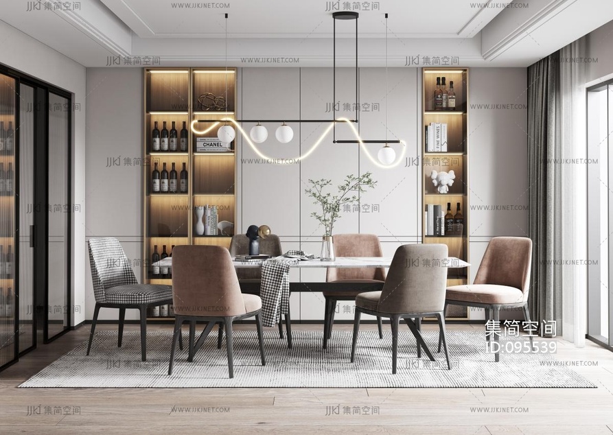 现代餐厅,餐桌椅,吊灯酒柜 3d模型下载 [模型ID:95539]