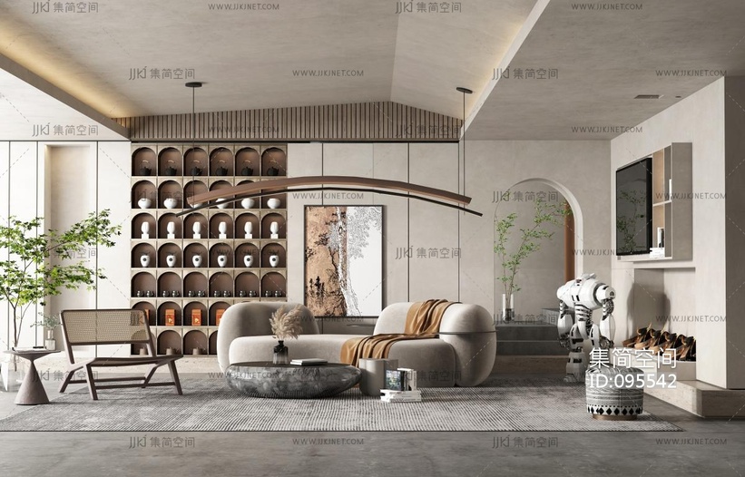 中古风客厅 沙发茶几组合 背景墙3d模型下载