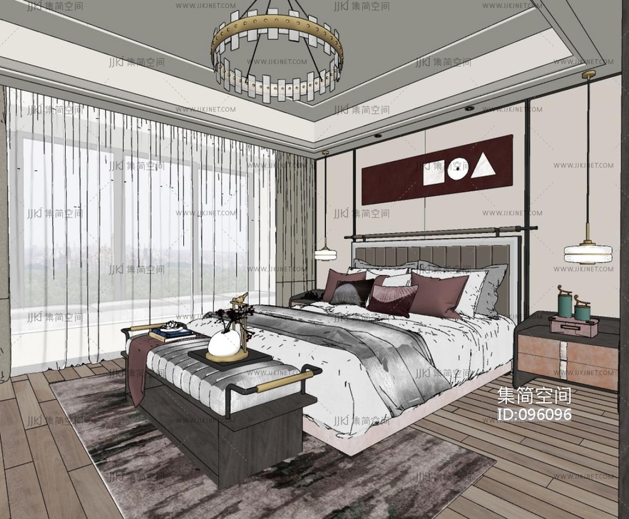 新中式样板间卧室 su草图模型下载 [模型ID:96096]
