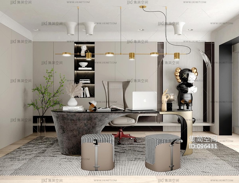 现代书房 书桌椅 壁柜 挂画 吊灯 书 盆栽 摆件3d模型下载