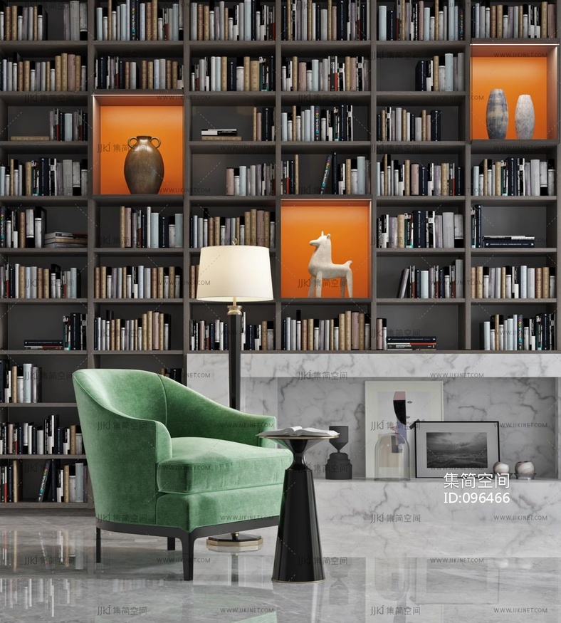 现代绒布休闲椅书柜,摆件 3d模型下载 [模型ID:96466]