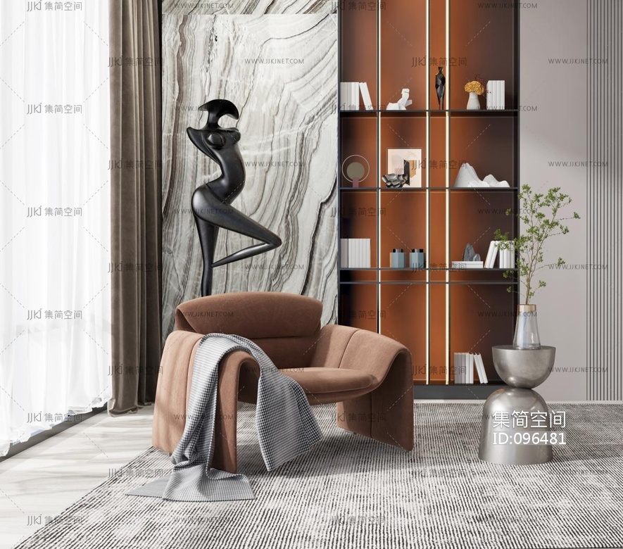 01-现代法式单人沙发_休闲椅_单椅_扶手椅圆形边几书本书籍玻璃水杯3D模型3d模型下载