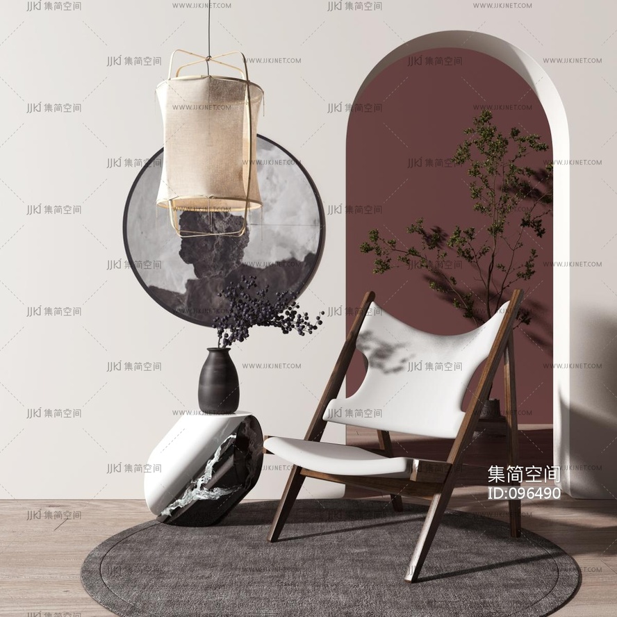 新中式折叠休闲椅边几,吊灯 3d模型下载 [模型ID:96490]