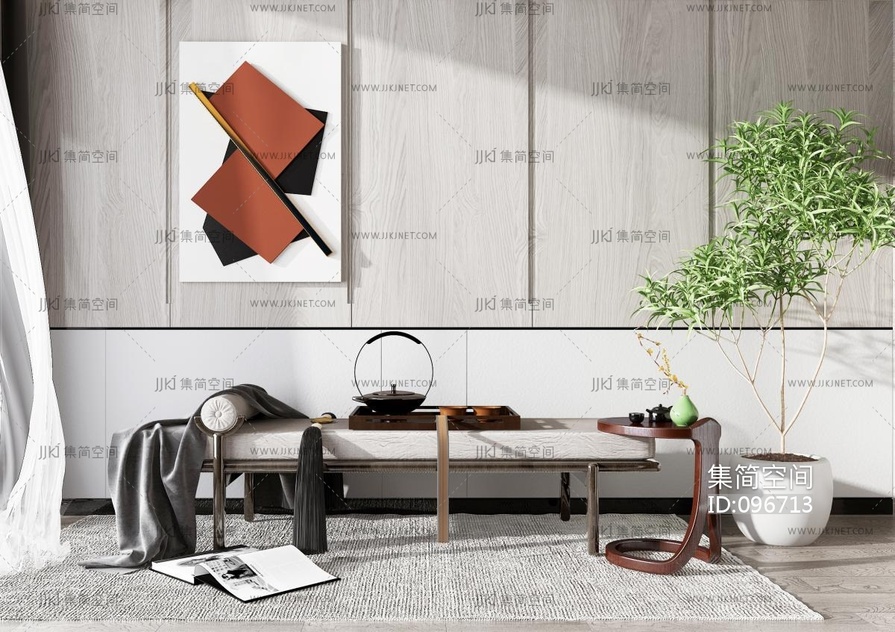 新中式床尾凳,脚踏,绿植盆栽,饰品摆件 3d模型下载 [模型ID:96713]