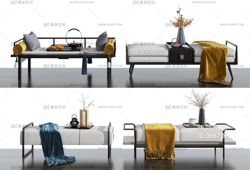 新中式布艺床尾脚踏,茶具,饰品摆件 3d模型下载 [模型ID:96726]