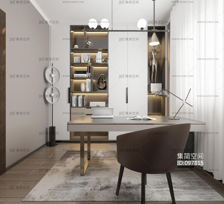 现代书房 书桌椅 壁柜 挂画 吊灯 书 盆栽 摆件3d模型下载