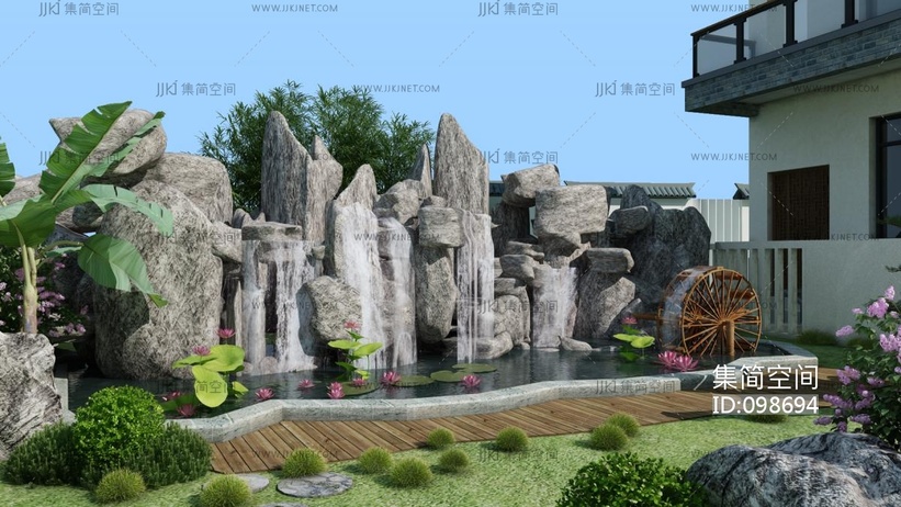 现代假山叠水,水车景观花园 3d模型下载 [模型ID:98694]