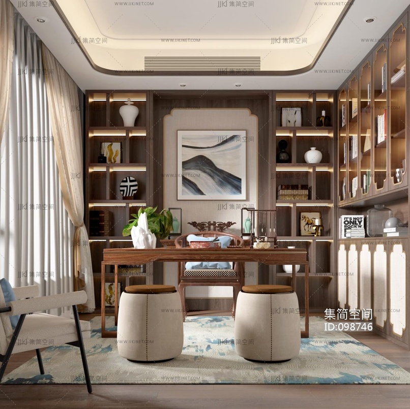 新中式书房,古典实木书桌椅圈椅 3d模型下载 [模型ID:98746]