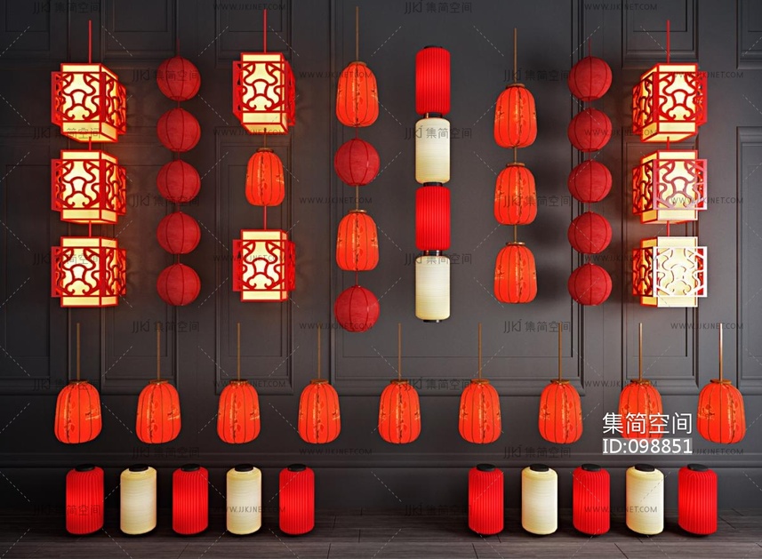 新中式红色灯笼吊灯组合 3d模型下载 [模型ID:98851]