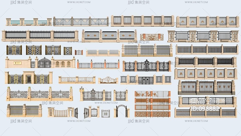 欧式新中式铁艺护栏院墙围墙,大门 3d模型下载 [模型ID:98882]