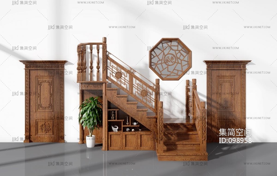 中式实木雕花楼梯栏杆花窗,木门 3d模型下载 [模型ID:98958]
