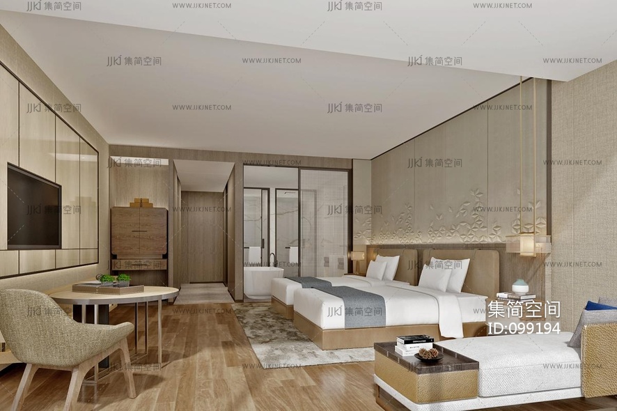 新中式酒店双床客房 3d模型下载 [模型ID:99194]