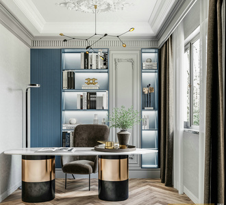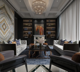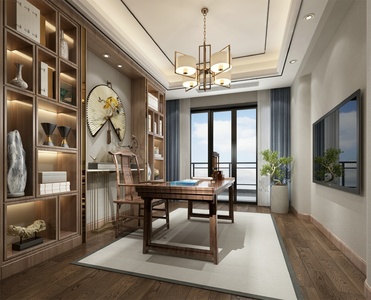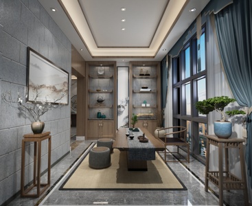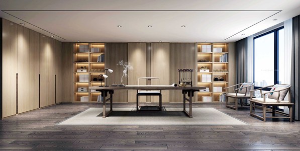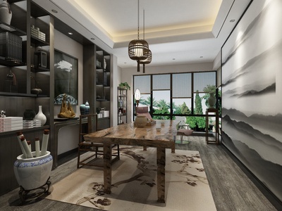 新中式书房,茶室,书桌椅,画案,笔架卷轴画