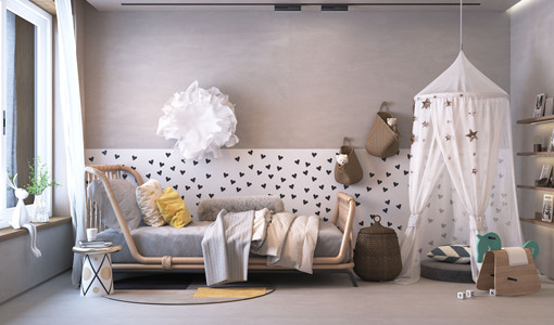 藤编床儿童房,床缦卧榻,女孩公主房