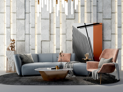 现代水泥背景墙皮革双人沙发