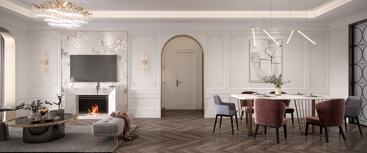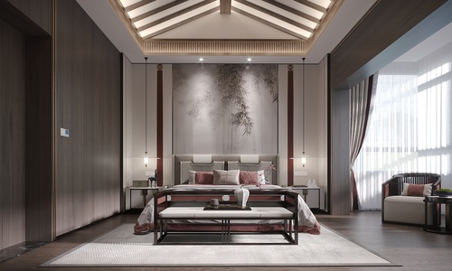 1新中式主卧,卧室样板间卧室,双人床,床头柜,床头柜,单人沙发