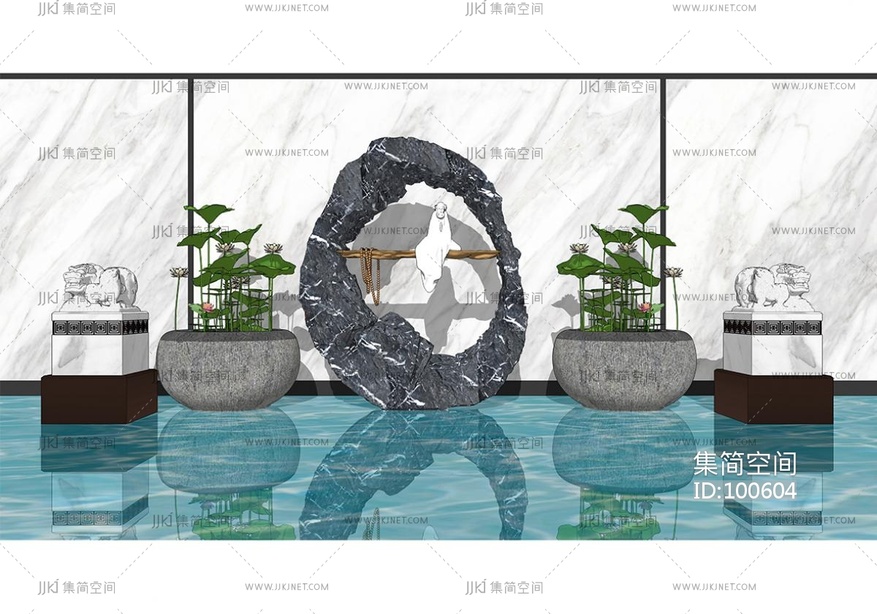 中式景观水景,荷花池,雕塑石雕配景 su草图模型下载 [模型ID:100604]