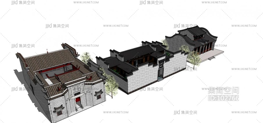 中式古建筑四合院寺庙建筑马头墙, su草图模型下载 [模型ID:102766]