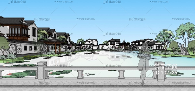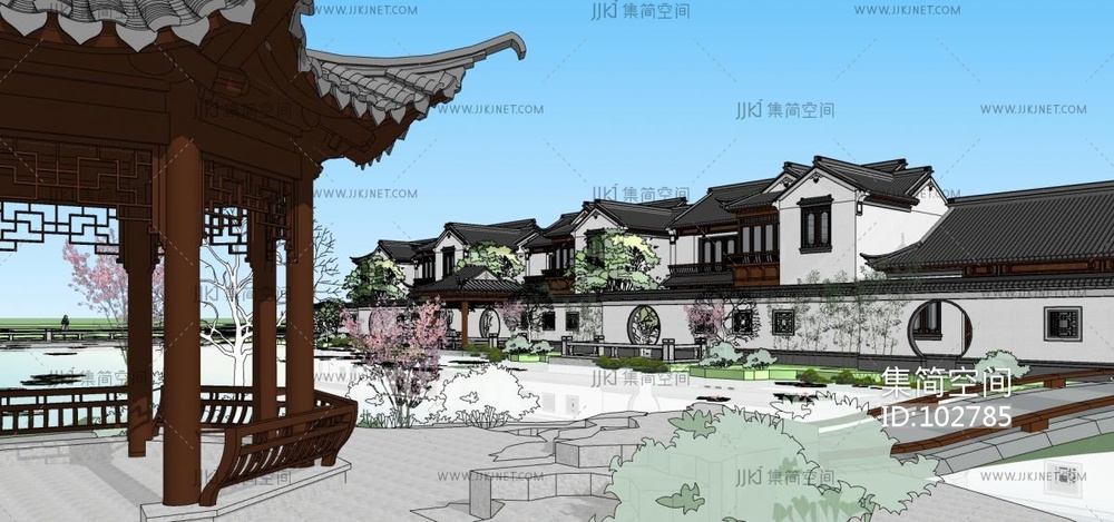 中式古建园林建筑外观公园花园荷花池,凉亭连廊廊架 (1) su草图模型下载 [模型ID:102785]