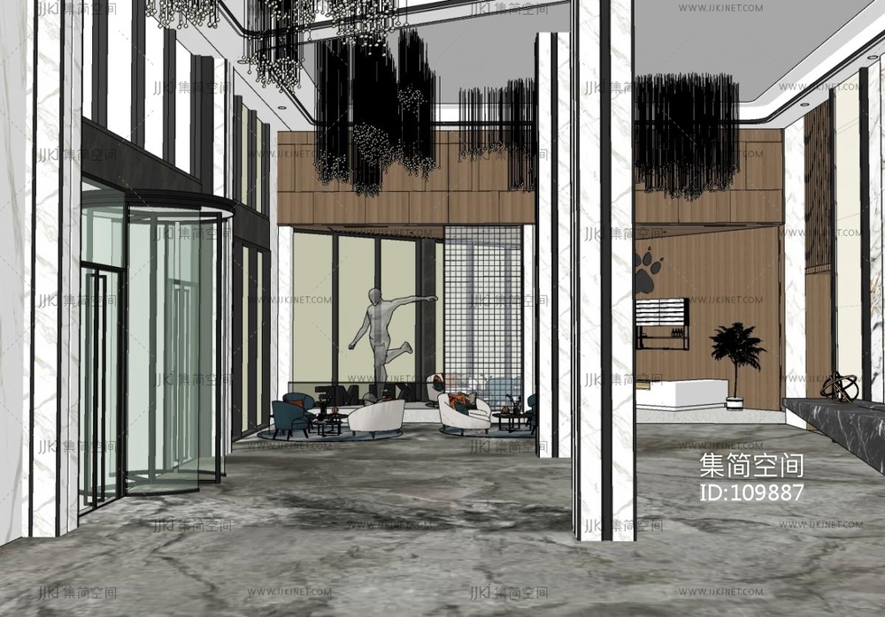 新中式酒店大堂,旋转门大厅su草图模型下载