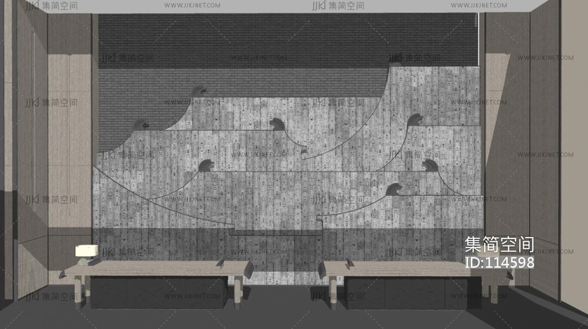 新中式瓦片背景墙、新中式吧台,长条凳子 su草图模型下载 [模型ID:114598]