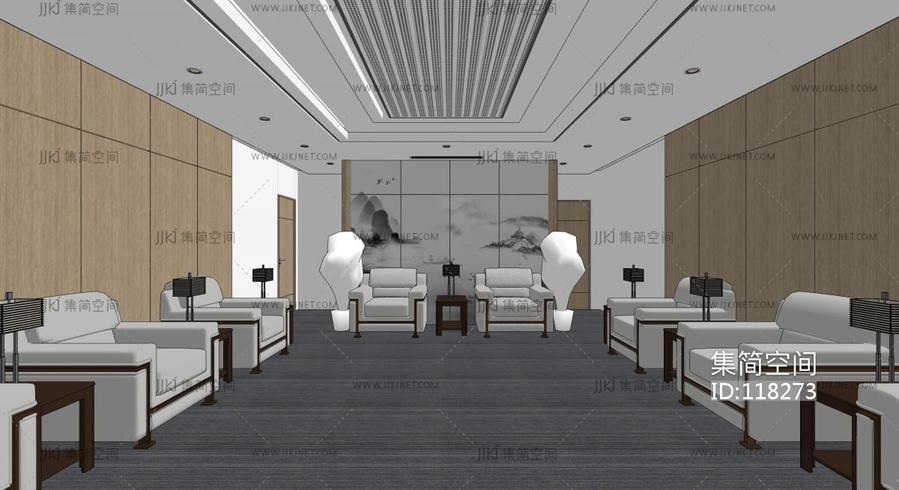 13新中式风格贵宾接待室、新中式单人沙发、新中式台灯、新中式沙发背景墙01 su草图模型下载 [模型ID:118273]