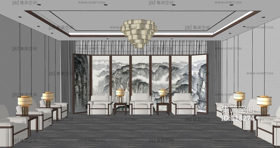 14新中式接待室沙发、新中式台灯、中式屏风画01 su草图模型下载 [模型ID:118274]
