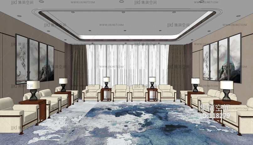 19新中式贵宾接待室、新中式单人沙发、新中式台灯、新中式组画 su草图模型下载 [模型ID:118279]