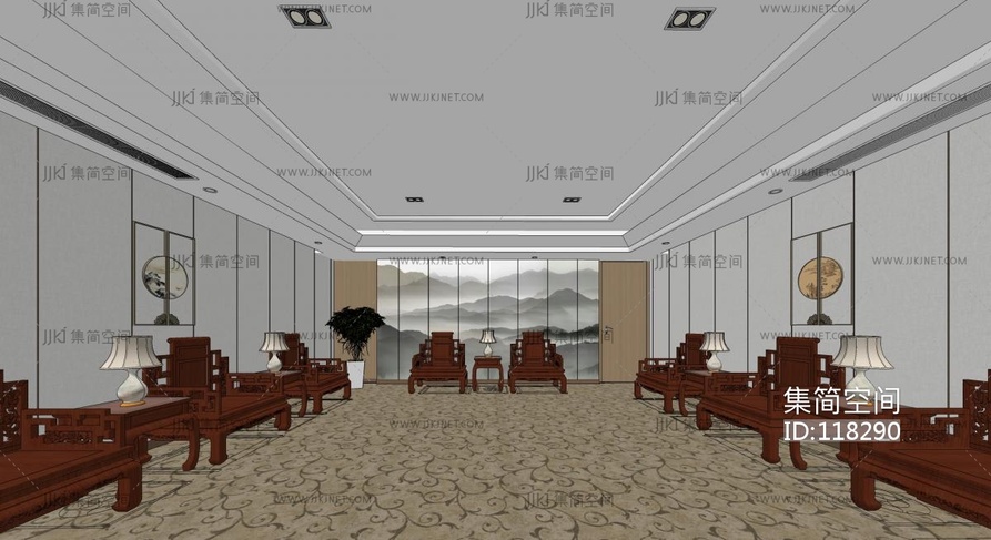 29中式贵宾接待室、中式实木沙发茶几边几 su草图模型下载 [模型ID:118290]