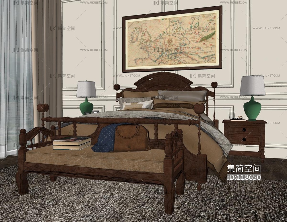 美式古典实木双人床 床头柜 台灯 脚榻 su草图模型下载