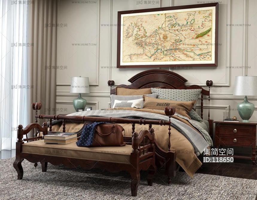 美式古典实木双人床 床头柜 台灯 脚榻 su草图模型下载 [模型ID:118650]