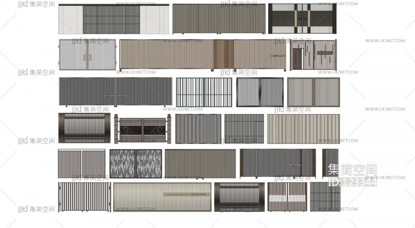 现代庭院门_消防常闭门_金属铁艺格栅大门_铁门_铁艺大门_子母门_住宅小区车行门 su草图模型下载 [模型ID:123344]