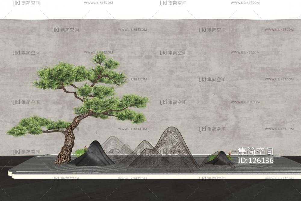新中式景观水景铁丝山脉盆景 su草图模型下载