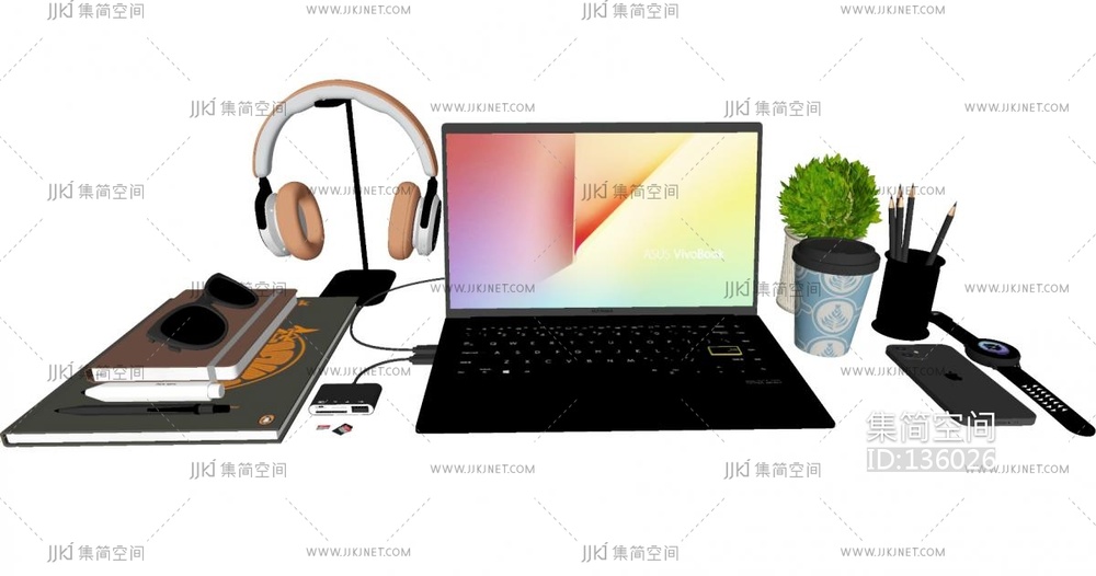现代办公用品书桌用品苹果笔记本电脑耳麦,笔筒笔记本su模型 su草图模型下载 [模型ID:136026]