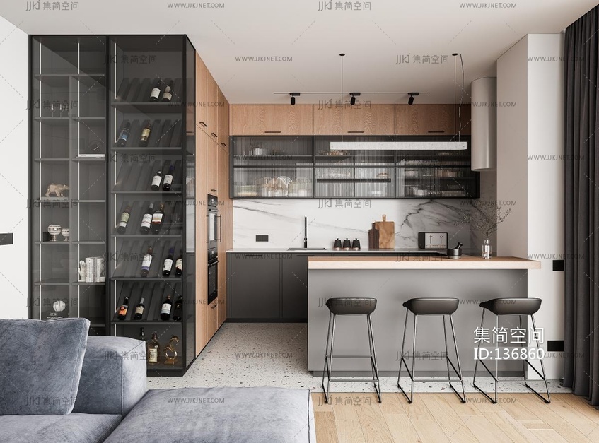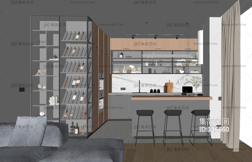 意式开放式厨房_餐厅厨房_岛台厨房_吧台SU模型su草图模型下载