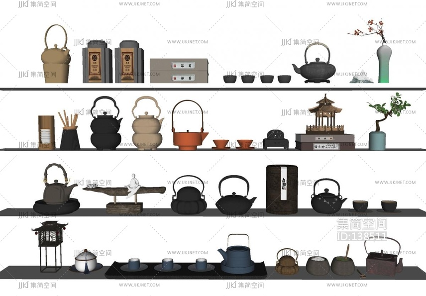 03-新中式茶具_茶叶_茶杯_茶饼_装饰柜_展示柜su模型su草图模型下载