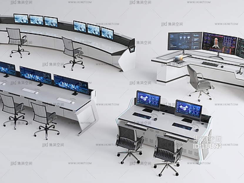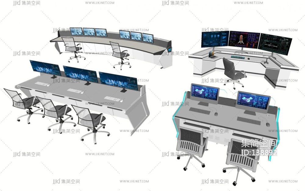 现代监控台,办公电脑桌椅SU模型 su草图模型下载 [模型ID:138892]